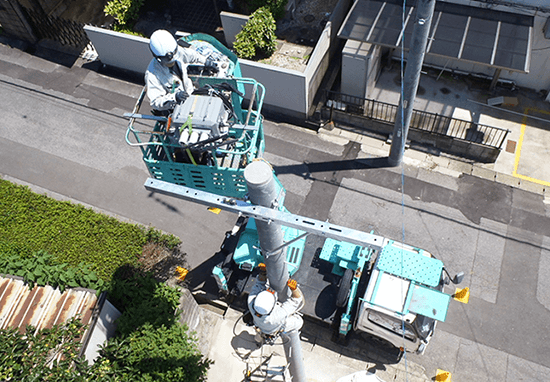 新築または増設する工場への電力供給のために、気中開閉器や高圧ケーブルを安全に設置し、電柱に取り付ける作業です。専門的な技術と安全管理を徹底し、安定した電力供給を支える重要な工事です。